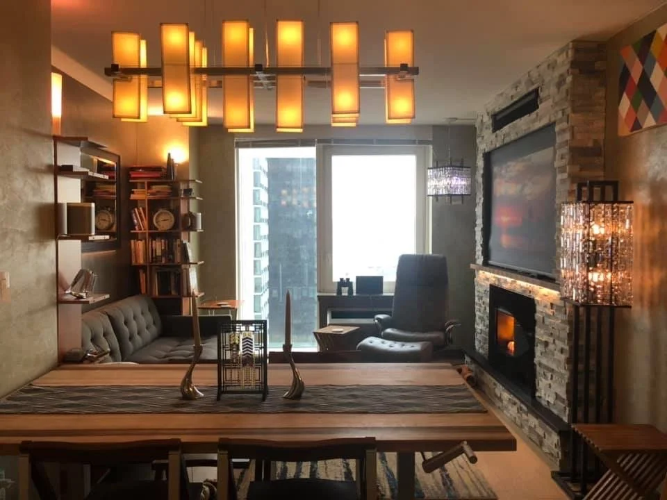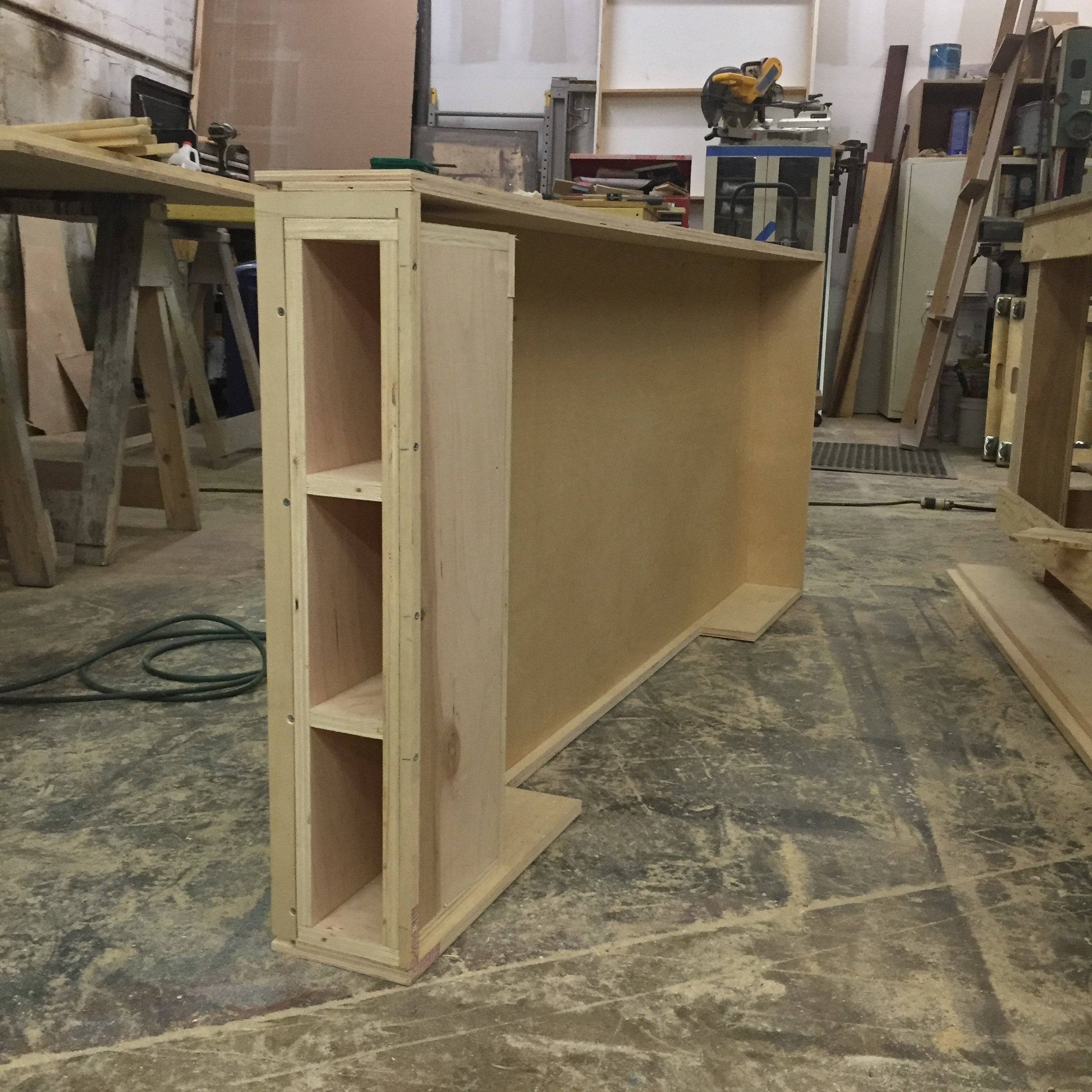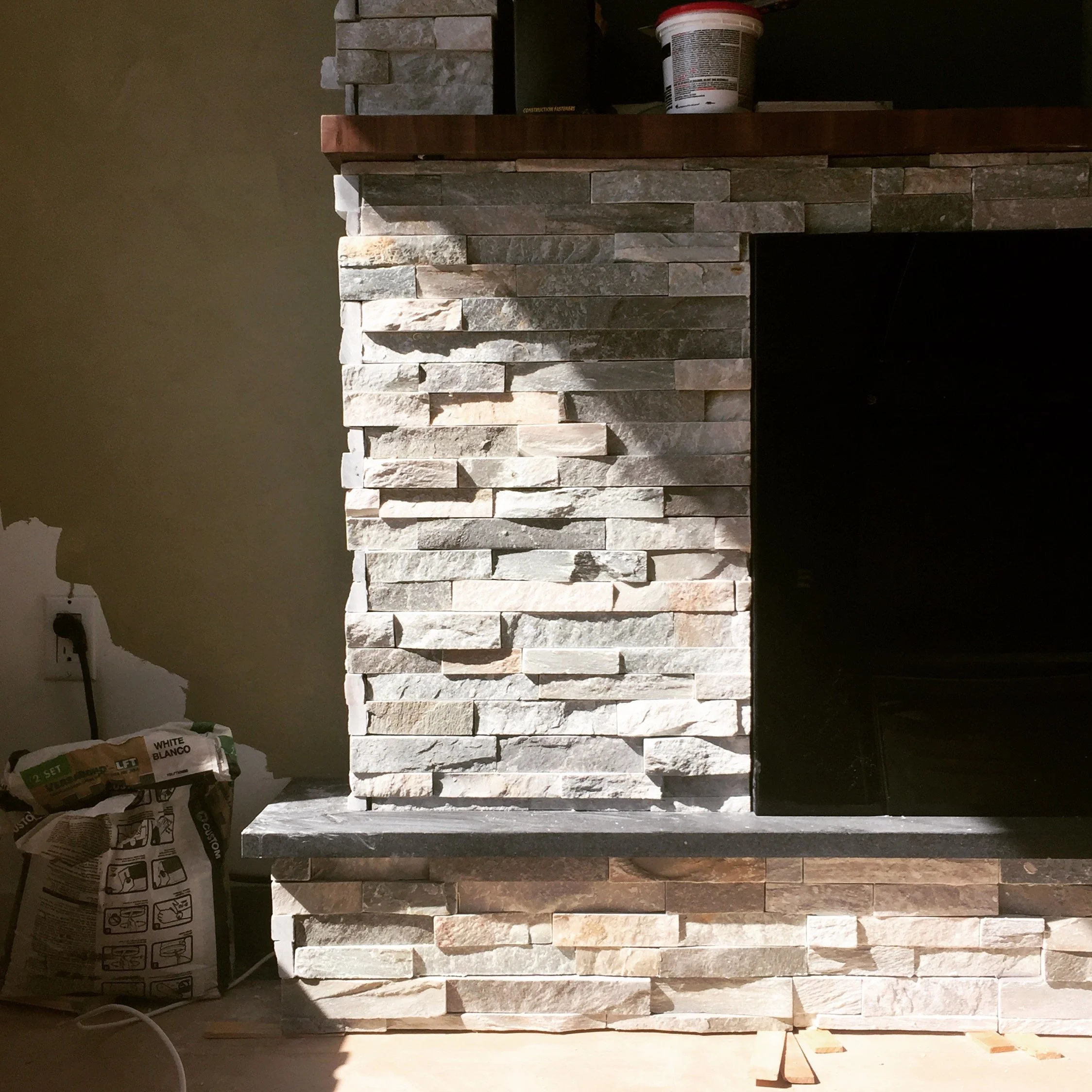 A friend of a friend contacted me about building a faux fireplace in his rather tight Long Island City Apartment. He had a length of walnut butcher block that he wanted to feature as a mantel and a number of entertainment components he wanted to integrate into the “chimney.” It was a fun challenge. I figured out the construction and the field stones to clad it in and found a granite slab offcut to use as a hearthstone. Michael McHale was very pleased and so was I.